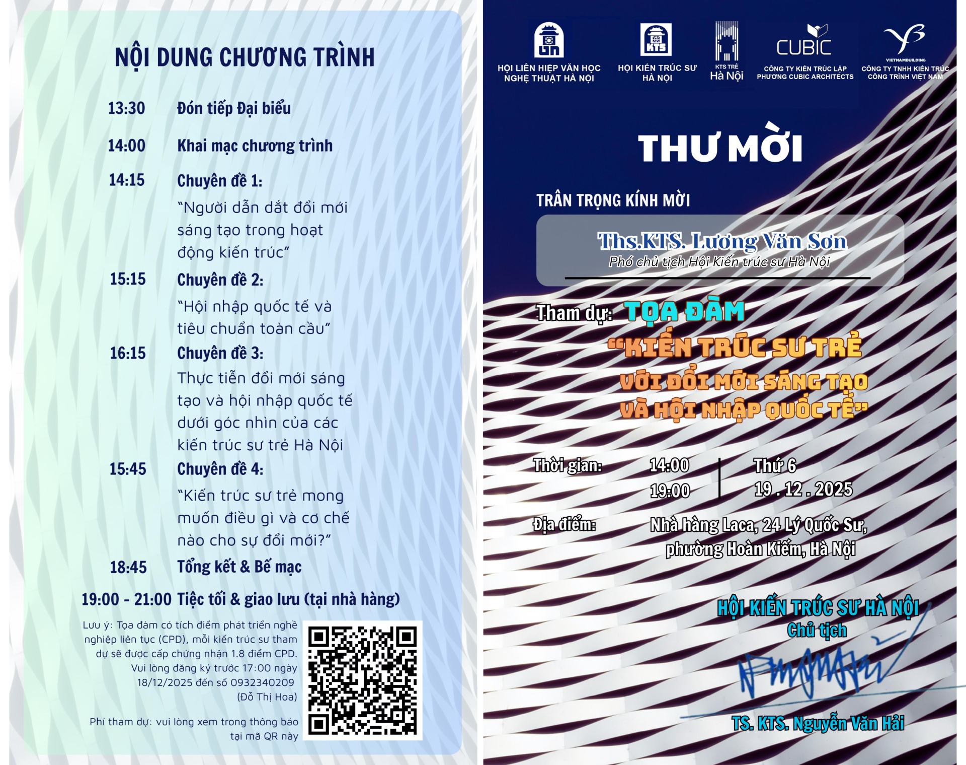 - Tham dự tọa đàm này, các kiến trúc sư có cơ hội được tích lũy 1,8 điểm CPD phục vụ cho việc gia hạn chứng chỉ hành nghề thiết kế kiến trúc (cụ thể xem thông báo CPD số 25421/TB-KTSHN ngày 11/12/2025 của Hội Kiến trúc sư Hà Nội đăng tải trên website Hội www.ktshanoi.org.vn).